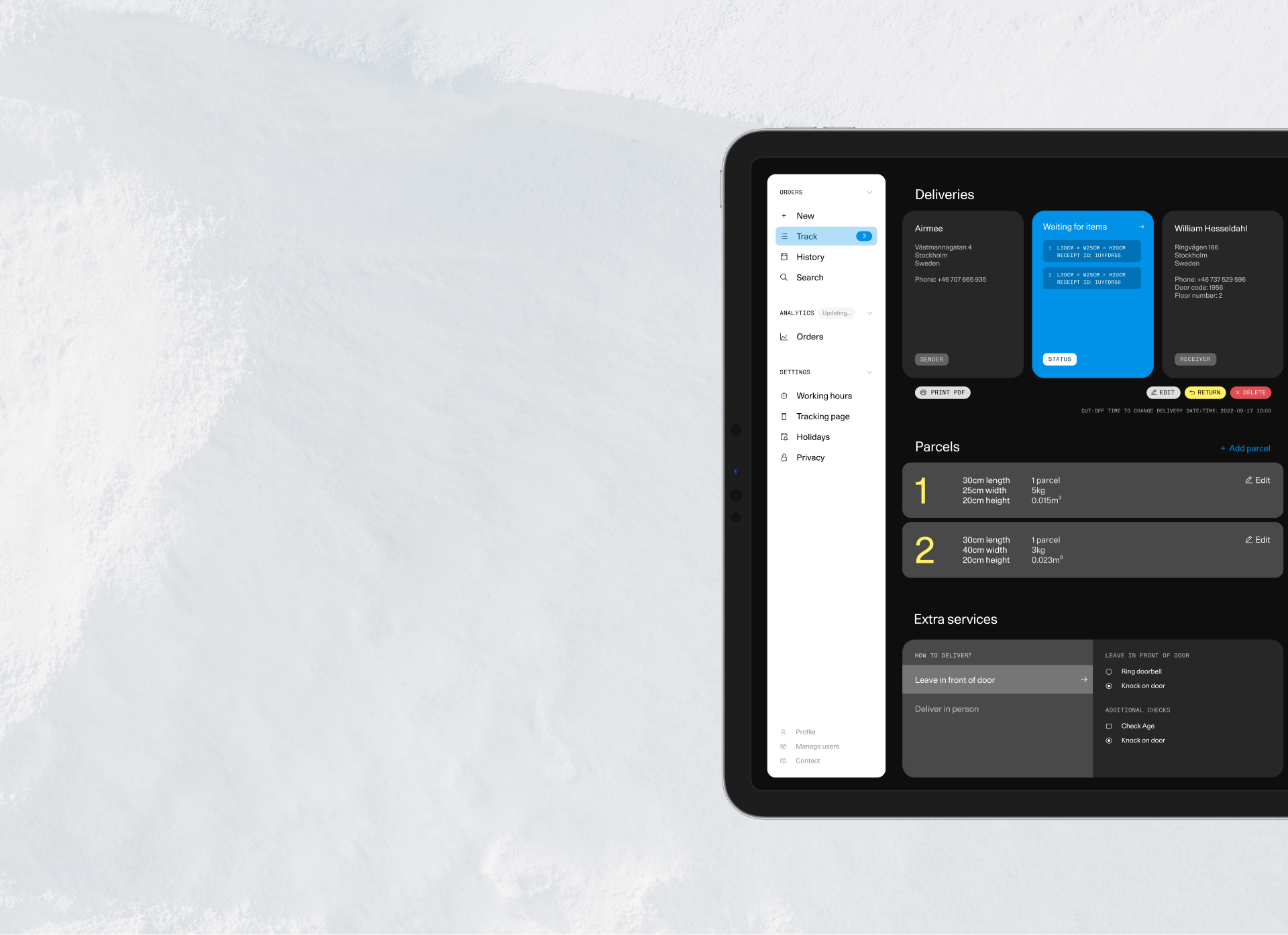 Fast and precise home delivery. Our home delivery meets all your consumers' preferences with deliveries in the evening, daytime and express, for small to bulky items, both same day and next day. We are delivering (90%+) on cleaner transportation with carbon neutral or emission free deliveries. Providing real time tracking via the Airmee app or tracking page. Catering for your unique needs such as ID check, age check, signature, personal delivery or leave outside door.